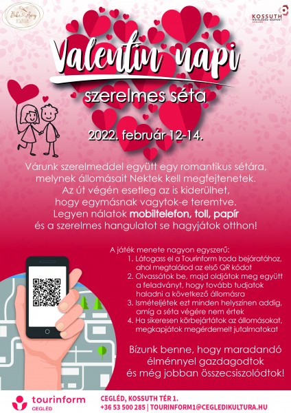 Valentin napi szerelmes sétára hívjuk a párokat, az érdeklődőket! Szeretettel ajánljuk a Tourinform Iroda, a Kossuth Művelődési Központ és a Bake Away Cukrászda közös programját!