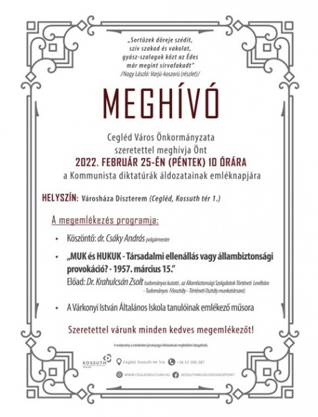 Cegléd Város Önkormányzata szeretettel meghívja Önt 2022. február 25-én (péntek) 10 órára a kommunista diktatúrák áldozatainak emléknapjára.