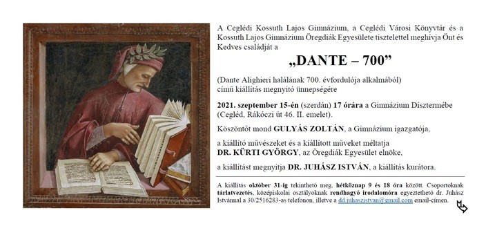 A Ceglédi Kossuth Lajos Gimnázium, a Ceglédi Városi Könyvtár és a Kossuth Lajos Gimnázium Öregdiák Egyesülete tisztelettel meghívja Önt és Kedves családját a "Dante-700" (Dante Alighieri halálának 700. évfordulója alkalmából) című kiállítás megnyitó ünnepségére 2021. szeptember 15-én (szerdán) 17 órára a Gimnázium Dísztermébe (Cegléd, Rákóczi út 46. II. emelet).